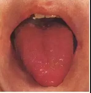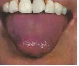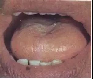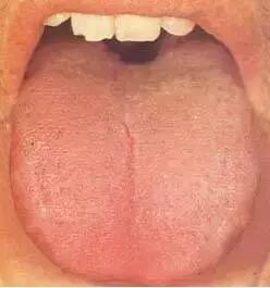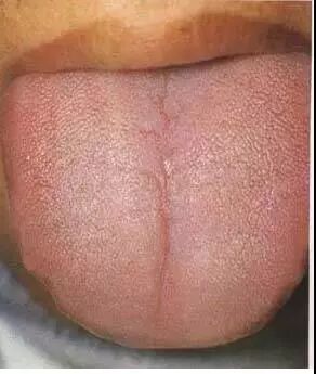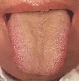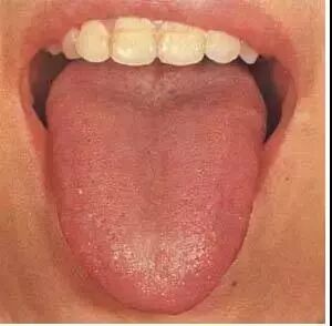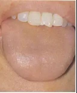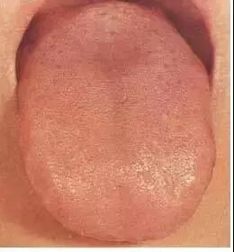 本图为正常舌苔。苔质滋润,干湿舌中,透过舌苔能见到淡红舌质,称为“薄白润苔”。提示胃气旺盛,津液充盈。