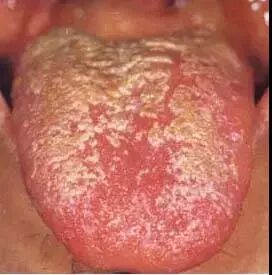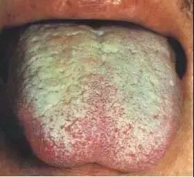 本图为黄腻苔满布舌面,舌苔的中前部腻苔正逐渐化燥,提示内热炽盛,湿邪化燥。