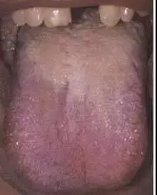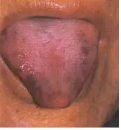 淡紫舌多见于阳虚阴盛之证。本图患者为肺原性心脏病,舌淡紫,苔薄白而湿润。提示阳气不足,血行不畅。