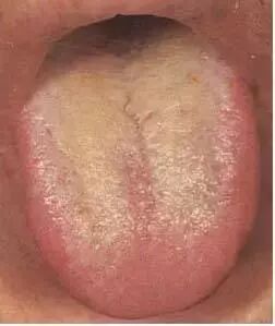本图患者为肺部感染,舌苔由白转黄(舌边尚有白腻苔残余),苔质干裂,舌红不鲜。提示疾病由寒湿化热、化燥,津液已伤。