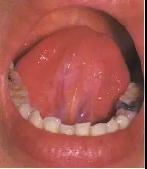 舌色青紫,由气血运行不畅所致。本图患者为慢性支气管炎继发感染、肺气肿、心力衰竭,舌色紫暗,苔白腻。提示痰饮内停、肺肾气虚,血行瘀滞。