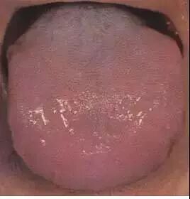 舌苔上水湿过多,扪之湿而滑利,甚则伸舌涎液欲滴,称为“滑苔”,多为水湿、痰饮内停。本图舌面过于湿润,舌苔薄白,根略厚,舌体胖嫩,舌边齿痕。提示阳虚不运,水湿内停。