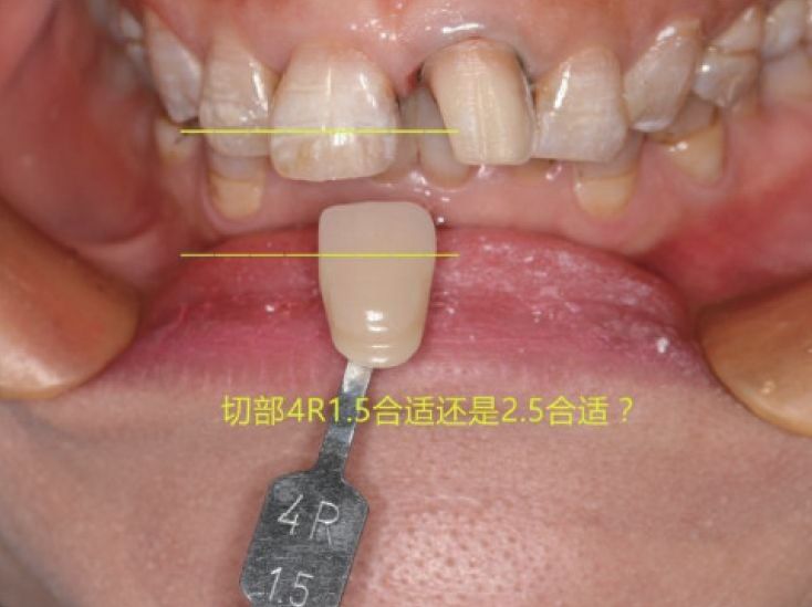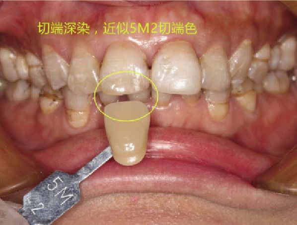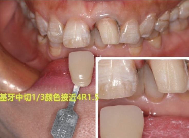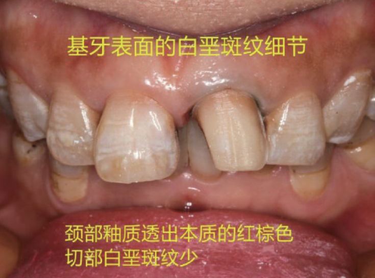 难点 该病例中,牙体大范围树脂充填,釉质损失多。患者天然牙位氟斑牙,仅修复21难度大。