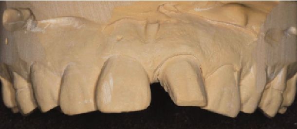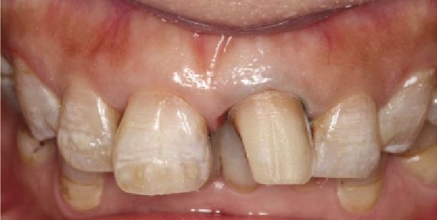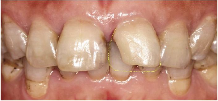 临床检查可见:21近中缺损达临床冠颈部1/3、切端近中1/4,可见屡次树脂充填形成的釉质短斜面,切端短于11。牙髓活力正常,无叩痛,不松动,龈缘高度对称,无明显红肿。11近中静止龋,发黑,唇面黄白色氟斑条纹。