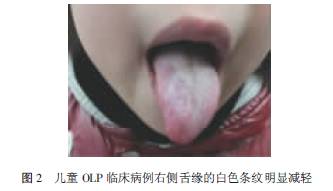 病例1患儿的口腔扁平苔藓临床表现为:上下唇的唇红粘膜有白色条纹,病损表面干燥,颜色呈暗红色,右侧舌缘有白色斑块,表面呈珠光色,病损区黏膜较光滑,舌乳头轻度萎缩;均无明显糜烂和出血。