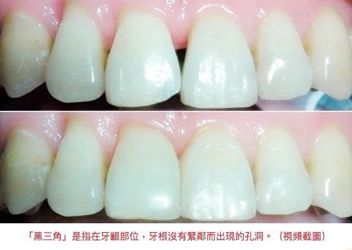 什麼是黑三角呢?简单来说,就是牙齿缝隙靠近牙齦部位有孔洞。牙齿矫正后,相邻的牙齿紧靠排列,可是贴近牙齦的缝隙,却没有被牙肉完全覆盖,结果形成三角形的间隙。