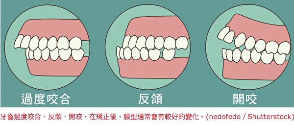 ● 反頜:俗称「地包天」,即牙齿咬合的时候,下牙咬在上牙外。牙齿反頜的人,脸型从侧面看会偏於弯月型。