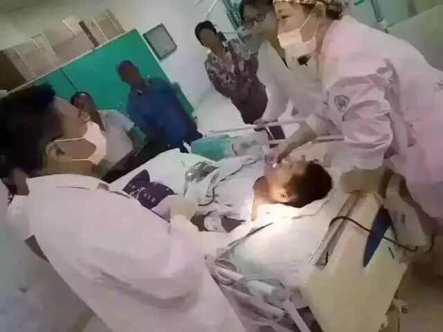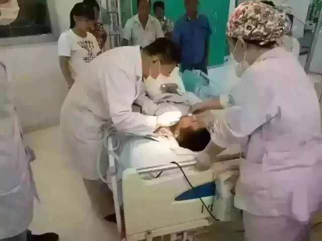 患者因颅颈外伤深度昏迷需要手术,术前需要做磁共振,要求拆除4,5金属冠(影响磁共振成像质量)!由于气管插管,不能上牙椅,患者口腔里的两个金属牙套,很难拆除!图为齐鲁医院专家某博士在为该患者诊治处理!