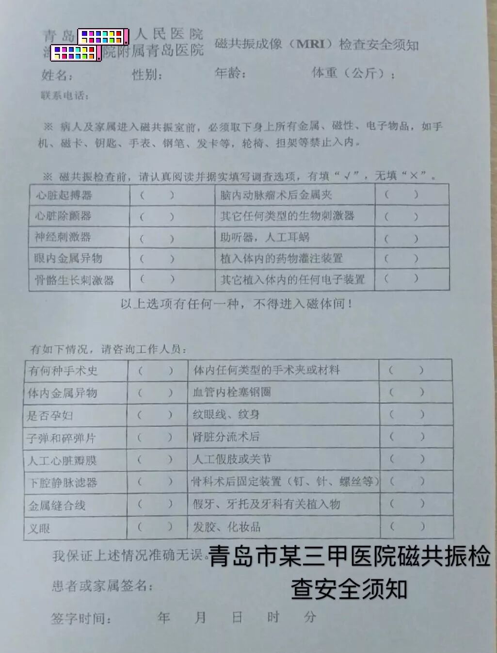 以上是某三甲医院进入磁共振前,须签署的安全须知。