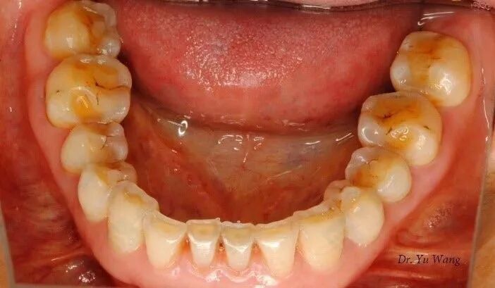 不良口腔卫生习惯导致的牙面软垢堆积,牙齿发黄