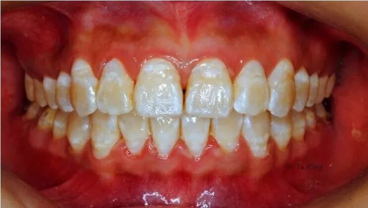 因饮水氟中毒导致的氟斑牙,呈花白外观