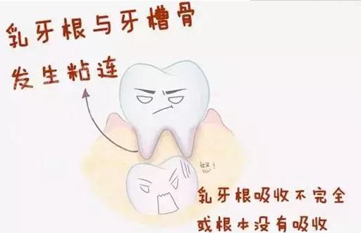 6、乳牙根与牙槽骨发生粘连,使乳牙牙根未吸收或吸收不完全,那么就可能不按时脱落。