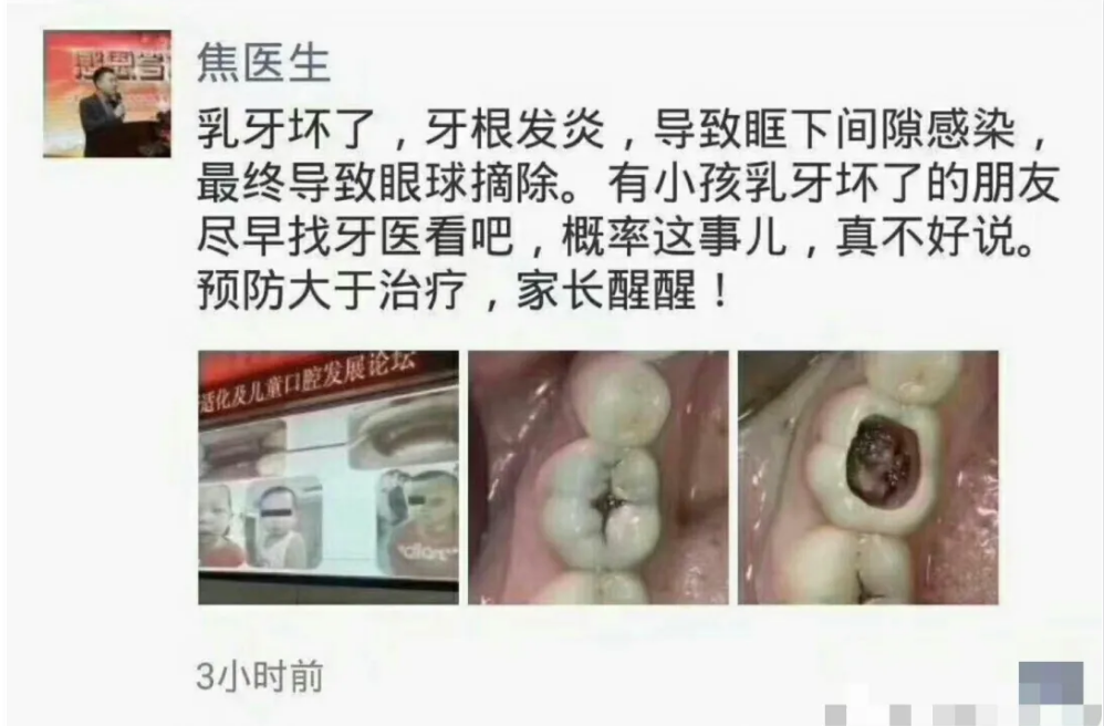 北京一个4岁的男孩,因为乳磨牙发生龋坏,牙根发炎,导致眼眶下间隙感染,最终为了保命,摘除了一只眼球。
