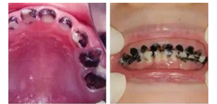 长期如此,宝宝的前牙会出现环状的黄、黑色斑块,甚至缺损等问题,医生把这种由夜奶导致的牙齿问题叫做“奶瓶龋”。