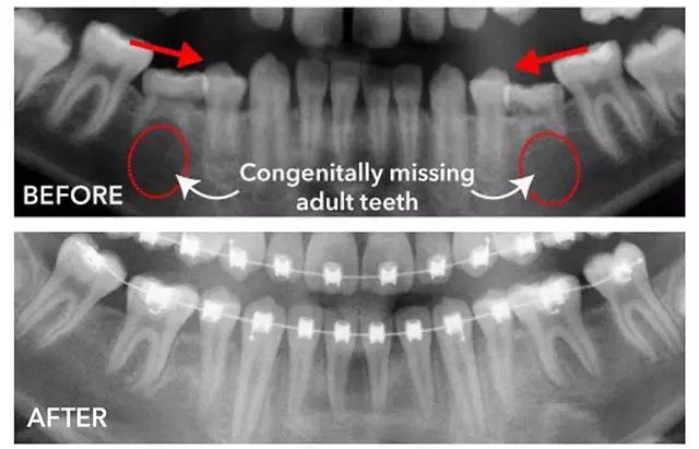 这种情况需要到医院借助X线片来判断,如果确定先天缺失,正畸医生会根据周围牙齿的排列情况选择合适时机、恰当方法进行治疗。
