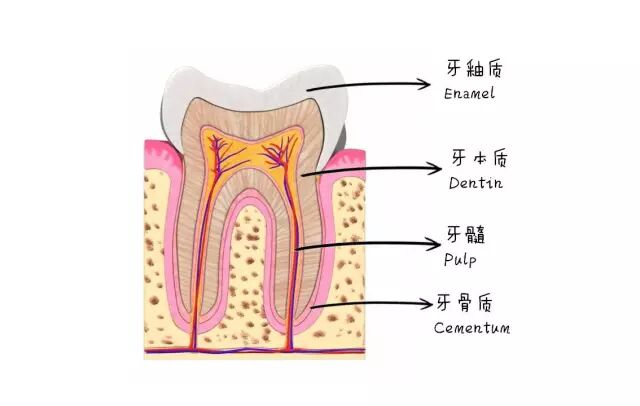 牙冠的最表层是乳色半透明的牙釉质,而牙釉质下方是淡黄色的牙本质。
