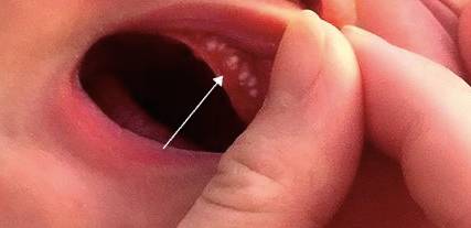 其实不然,这是一种叫“上皮珠”的东西,俗称“马牙”或“板牙”,并不是真正的乳牙。
