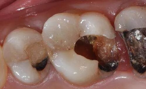 ● 深龋:患者会出现强烈的牙疼,夜间自发疼痛等。能观察到明显的龋洞,可能发生食物嵌塞的情况。如果孩子发展成深龋,此时孩子疼的大哭,爸爸妈妈担心睡不着,造成孩子疼痛,大人心疼的局面。看图赶紧自测: