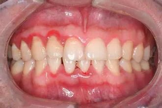 牙龈炎阶段:牙龈红肿出血,牙齿周围有牙石