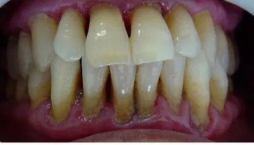 晚期牙周炎:牙槽骨几乎完全被破坏,牙齿松动、脱落