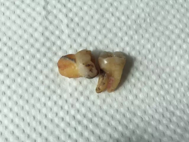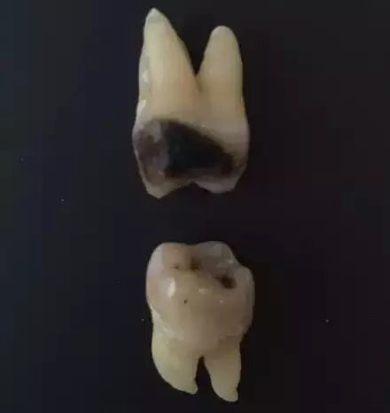 来看下面这张,从X光片上看,两颗智齿对颌萌出,位置看似也很正是吧。然而,拔下来之后是这样的: