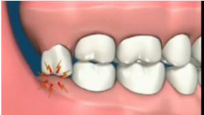 这种智齿的牙体与牙龈之间形成一个狭窄较深的盲袋,容易嵌入并积存食物碎屑和细菌,刷牙时难以清净到这个部位,加之冠部牙龈易因咀嚼食物而损伤,形成溃疡。当全身抵抗力下降、细菌毒力增强时,就可能引起牙冠周围组织炎症,出现明显的疼痛、牙冠周围软组织发炎红肿、龈瓣边缘糜烂、张口困难等症状。