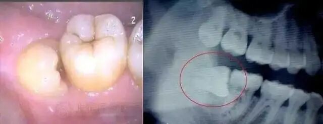 如果智齿位置及方向长得正,而且有良好的咬合关系,就可以考虑保留,但是如果像下面图片所示,牙齿朝前生长,那就要及早拔掉。