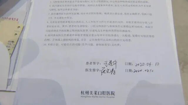随后,医院出示了一份“种植治疗知情同意书”,上面第四条写道: