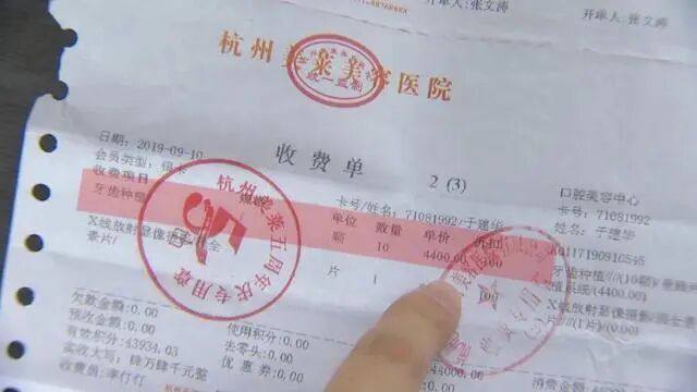 于女士说,医生给出的方案是:上排种植6颗,下排种植4颗,每颗4400元,再加上2颗烤瓷牙的费用。最终,于女士在去年9月,分两次共缴费55000元。
