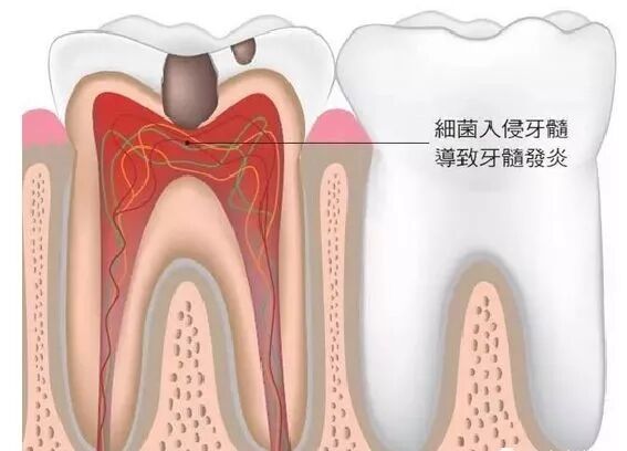 蛀牙坏到牙齿内部,牙髓或细菌感染引起了急/慢性牙髓炎;