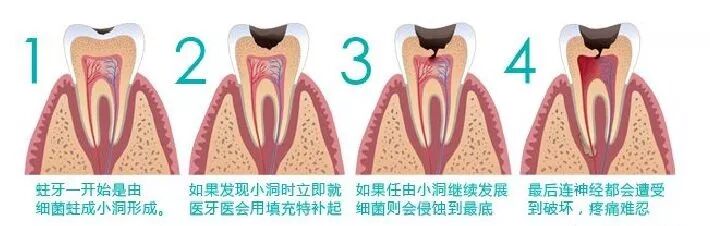 当蛀牙才刚刚萌发的时候进行治疗,只需要简单补牙就可以解决了;但当蛀牙侵害到牙髓和神经,就不得不根管治疗了。