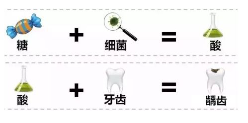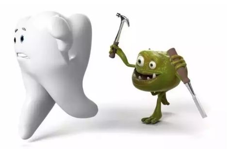 当你吃了甜食后,口腔里的细菌开始工作了,将糖发酵产酸。在酸的作用下,牙齿表面就会被腐蚀破坏。
