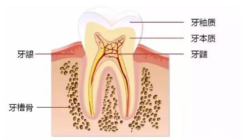 牙冠最外层这白色半透明的结构叫牙釉质,牙齿所有组织中数它最坚硬,其硬度仅次于金刚石。它像一个金刚护甲一样包裹着整个牙冠,保护牙齿内部的组织。在牙釉质和牙骨质的内部就是牙本质,构成牙齿的主体。牙本质颜色淡黄,以上三种都属于硬组织,层层包裹着最内部的髓腔,髓腔里有神经和血管,老百姓一般俗称的牙神经就是这个。