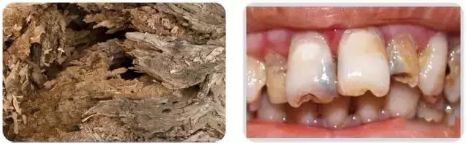 我们的牙齿跟木头一样,年久失修不注意保养就会蛀掉。看下面的牙齿,黑色和黄色的部分就是蛀坏的部分。