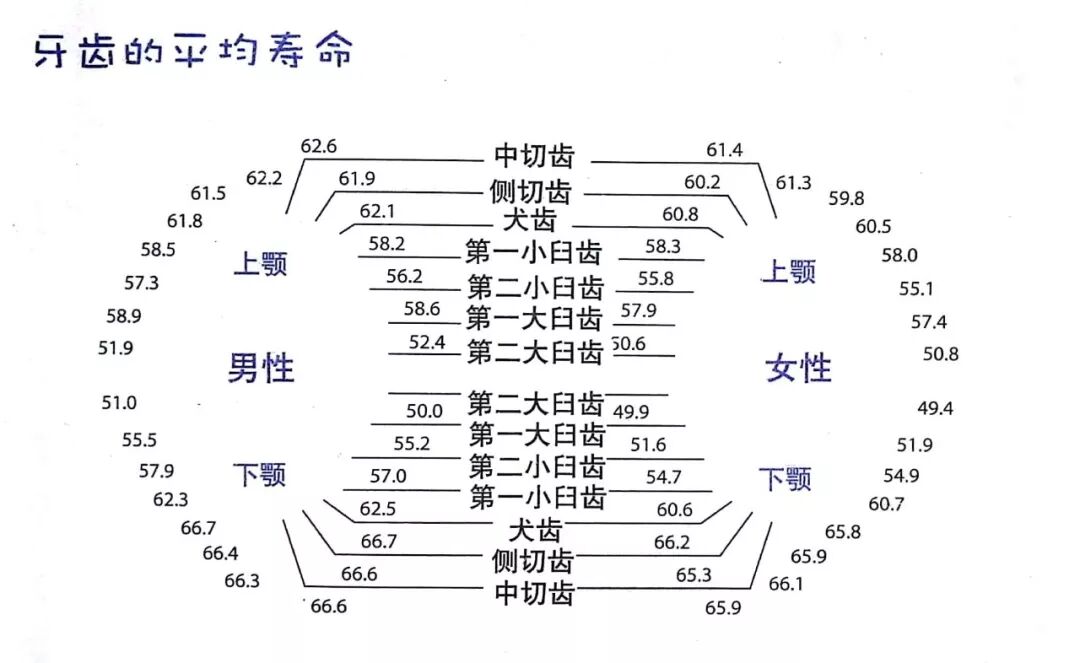 不同牙齿的平均寿命为50~60年,若是生活在平均寿命50年的年代,相信大部分人都不必为牙齿担心,