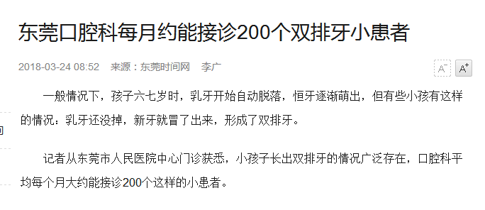 “双排牙”一般在七八岁的孩子中最为常见,通常发生在下牙,也有上牙长双排牙的现象。仅仅东莞市人民医院门诊,每个月就要接诊200个这样的小患者。