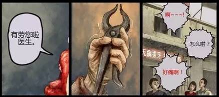 拔牙时,牙医用锤子、凿子、钳子类的工具在嘴里敲打,震的眼泪鼻涕都流满面。