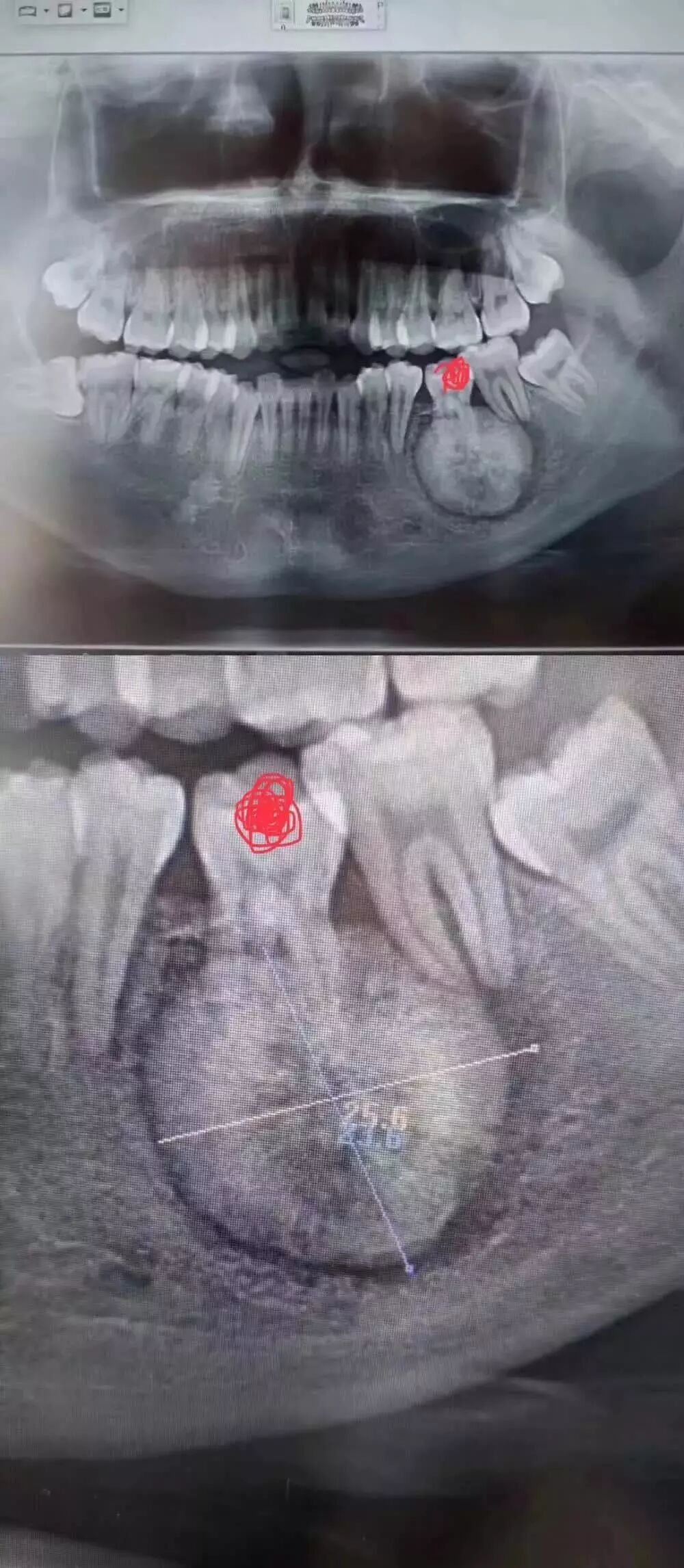 “患者是30多岁的年轻男子,红色标记那颗牙松动,要求拔牙,开始嫌麻烦不愿拍片,后来经过再三劝说还是拍了片。