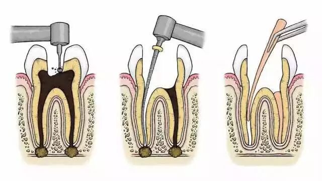 首先会清除根管内的炎症牙髓和坏死物质,接下来测量根管长度,并适当扩大根管(即根管预备过程),然后在根管内封药消毒,最后用药物充填根管。