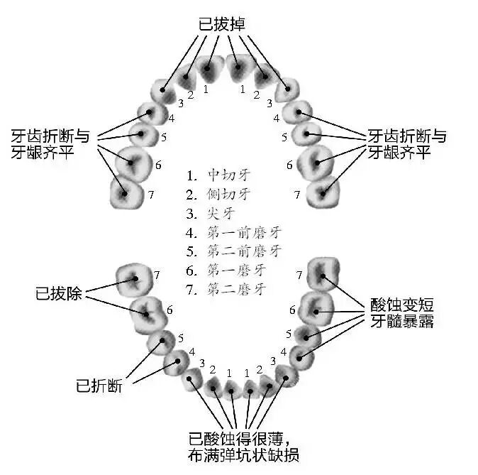 男孩的这28颗牙齿,其中上门牙6颗、下磨牙2颗,因为烂得太彻底,已不得不拔掉了。