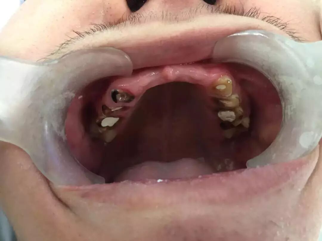 满口牙齿中,还算“有点样子”的只剩6颗下门牙,但也被腐蚀得很单薄,牙体几乎变透明了,基本上只要一咬骨头,也会马上碎裂。