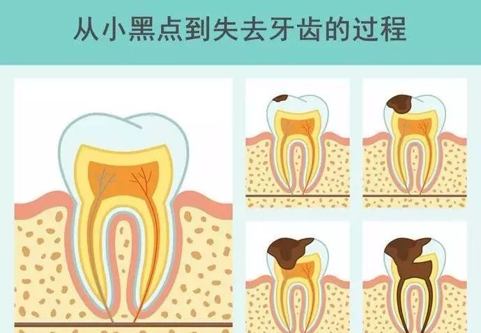 一颗牙齿从发现小黑点,任其发展就会形成明显的蛀洞,最后整颗牙可能都坏掉。
