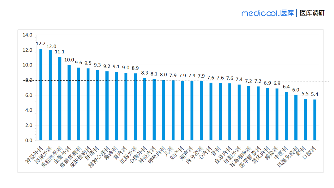 到底哪些科室的医生收入比较高呢?我们可以发现位居榜首的是神经外科,其次是泌尿外科,而重症医学科、血管外科、麻醉疼痛科的医生收入分列第三、第四和第五位。口腔科位居三十个科室倒数第一,平均年收入为5.4万。