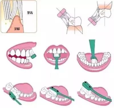 将牙刷倾斜45度角,保证刷毛可以刷到牙齿与牙龈接触的区域,以及游离牙龈。