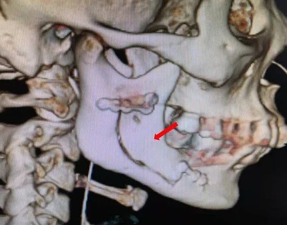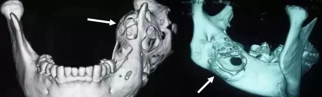 可就在上周,牙疼的程度已经进展到让小莫难以忍受。在家人的陪同下,他来到了杭州市第一人民医院。本以为是简单的牙痛,可令所有人没想到,颌骨3D-CT显示,颌骨被病变“吃掉”了二分之一,里面空了一个“大窟窿”,也就是说,右侧下颌骨体连同整个升支部存在大范围的骨质破坏。