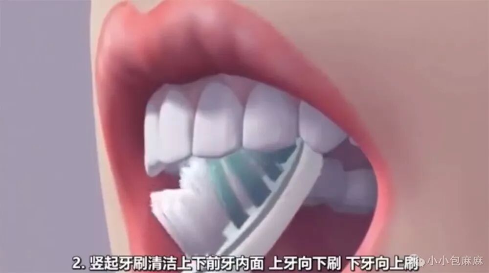 竖起牙刷上下前牙内面,上牙向下刷,下牙向上刷。