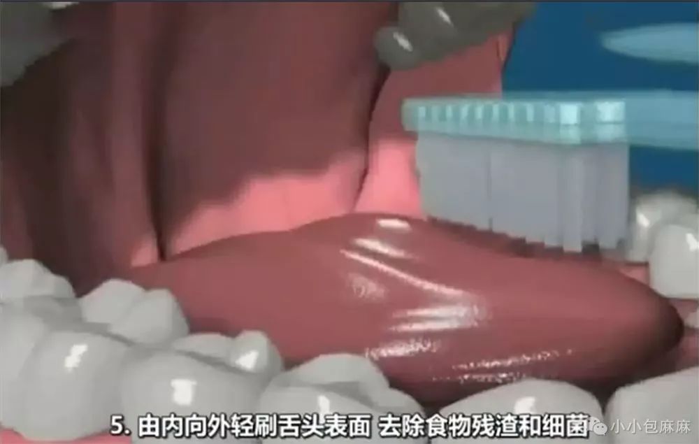 轻刷舌头表面,由内向外轻轻去除食物残渣。