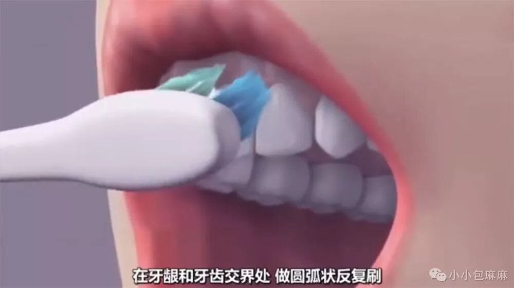 选择软毛牙刷,毛刷与牙齿呈45°,在牙龈和牙齿的交界处,做圆弧状反复刷。