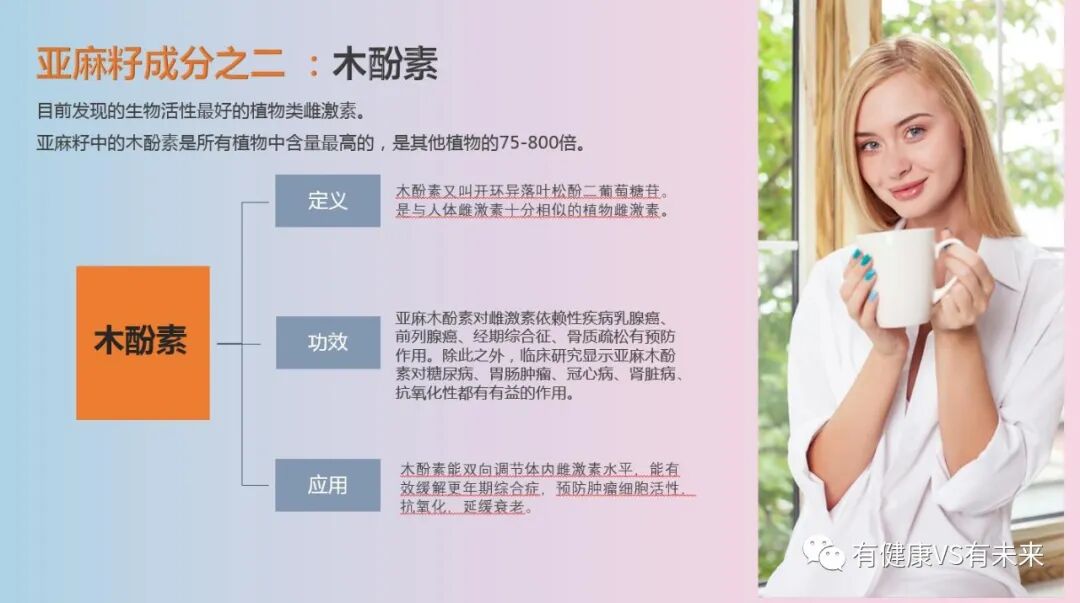 首先,亚麻籽粉中木酚素的含量,是目前世界上已知的物种中最高的,而木酚素对抗癌与丰胸的作用是赢得世人共识的。