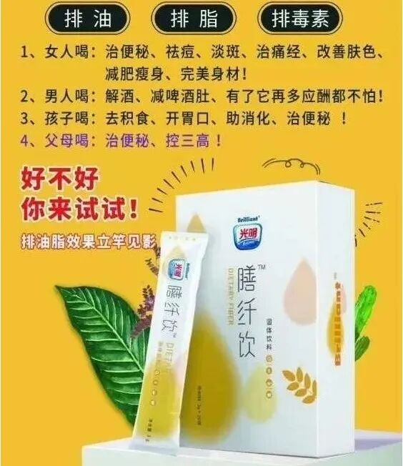 光明膳纤饮是一款固体饮料,经常饮用可以起到排油排毒、减脂瘦身、清理肠道垃圾毒素的效果。在你吃了很多高热量,高脂肪,油腻的食物之后,喝一杯光明膳纤饮可以阻断荤菜90%的脂肪吸收,阻断米饭面食等40%的淀粉吸收,10小时内排出淀粉热量,20小时内排出脂肪油脂,光明膳纤饮双阻双排的功效,让你大餐不后悔,饮食无负担,彻底消灭饮食恐惧症。
